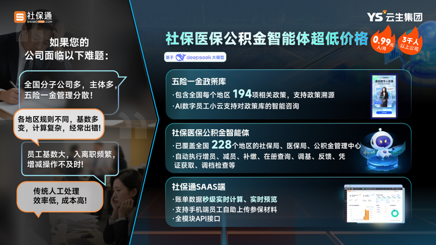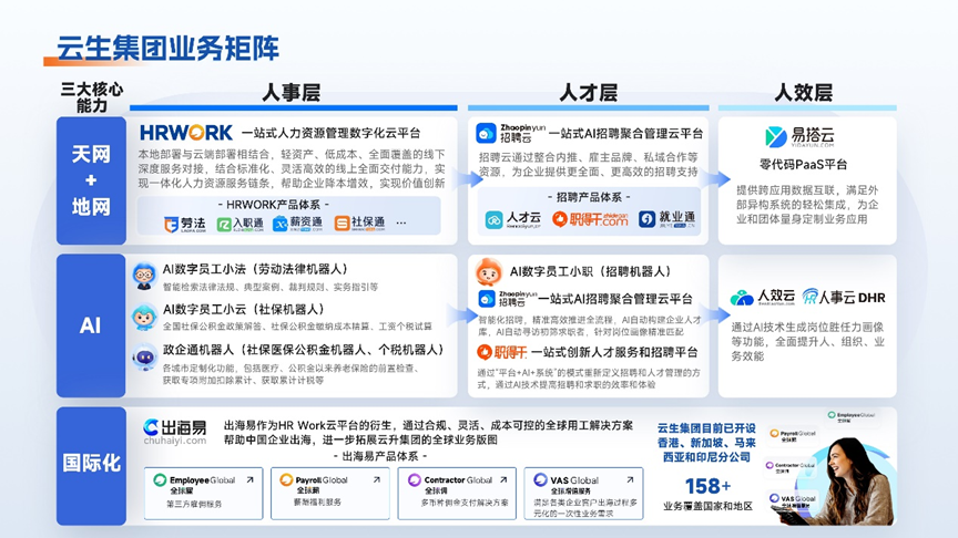 这样AI在人力资源领域的应用就形成了闭环:AI招聘,解决“进人”问题;AI社保/法律/出海,解决“合规与风险”问题;AI人效,解决“产出与价值”问题。正契合云生集团AI+“人事、人才、人效”三层核心体系的战略发展方向。