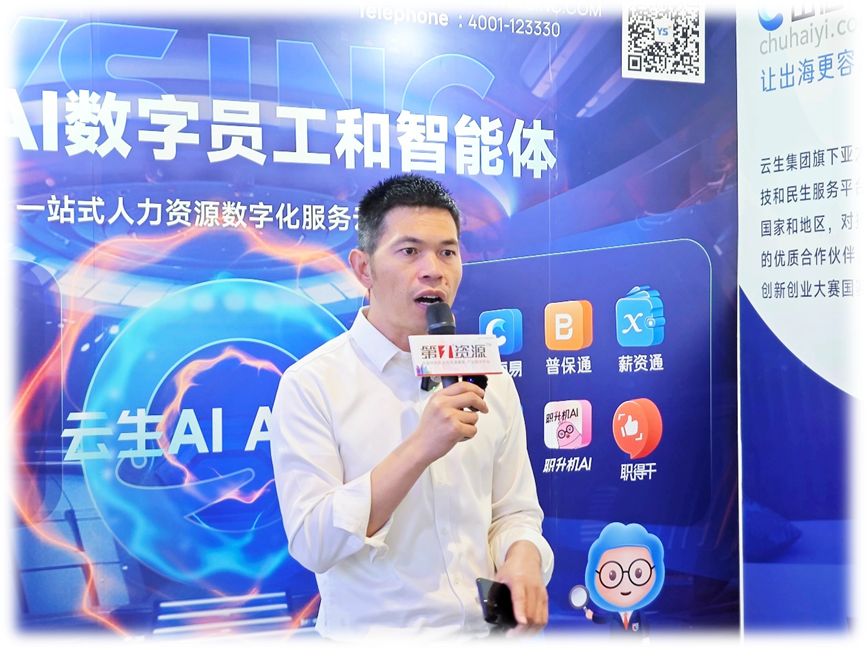 云生集团市场总监张建生在云生展位接受了人力资源行业媒体《第一资源》的访谈,他介绍了“社保医保公积金智能体”和出海服务平台“出海易Chuhaiyi”。张建生认为,人力资源科技企业未来大有可为,技术与服务结合,能够解决服务场景应用;与行业结合,能够提升行业发展能力;与岗位结合,能够提高岗位人效。正如云生“社保医保公积金智能体”解决了大型企业的全国五险一金缴纳难题,“出海易Chuhaiyi”能够为中国企业出海保驾护航。