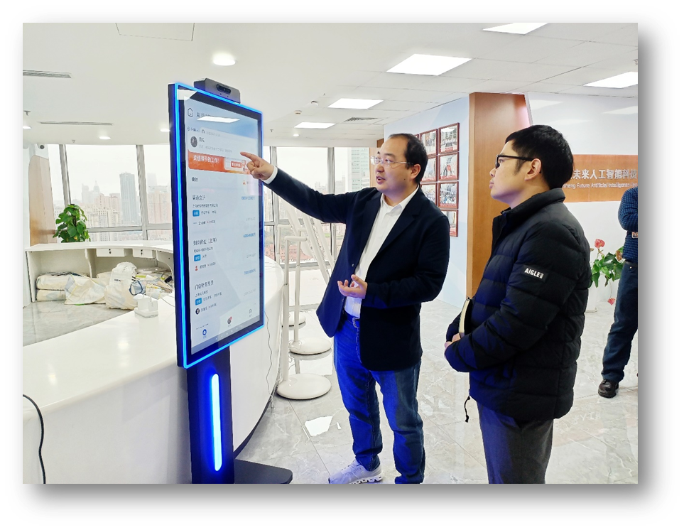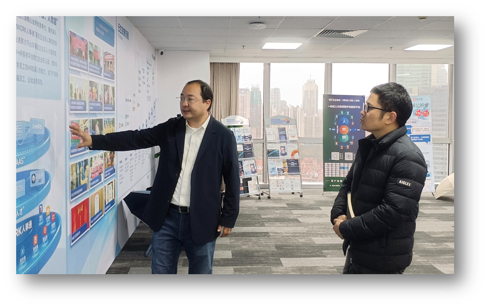 李贤威带领领导一行参观了云生全球创新中心,详细介绍了云生集团的经营发展概况、核心业务优势、科技创新成果等。互动展厅内,李贤威向领导一行演示介绍了云生AI智能体产品在人才招聘、政策咨询、合规管理等人力资源服务场景中的应用,重点讲解了云生集团如何通过AI数字员工和HR智能体为企业提供全生命周期人力资源数字化服务。李贤威表示,云生集团深耕人力资源领域十余年,以“人事、人才、人效”为核心脉络,在AI赋能人力资源的道路上持续探索创新,助力企业提质降本增效。