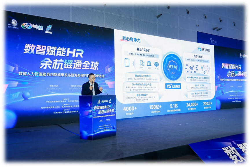 近日,第四届数贸会配套产业活动——数智人力资源服务创新成果发布暨海外服务枢纽揭牌活动在数贸会人工智能展馆举办。云生集团副总裁刘丰枝受邀担任分享嘉宾,云生集团获颁“余杭区2025数智HR先锋奖——数智人力资源先锋机构”。