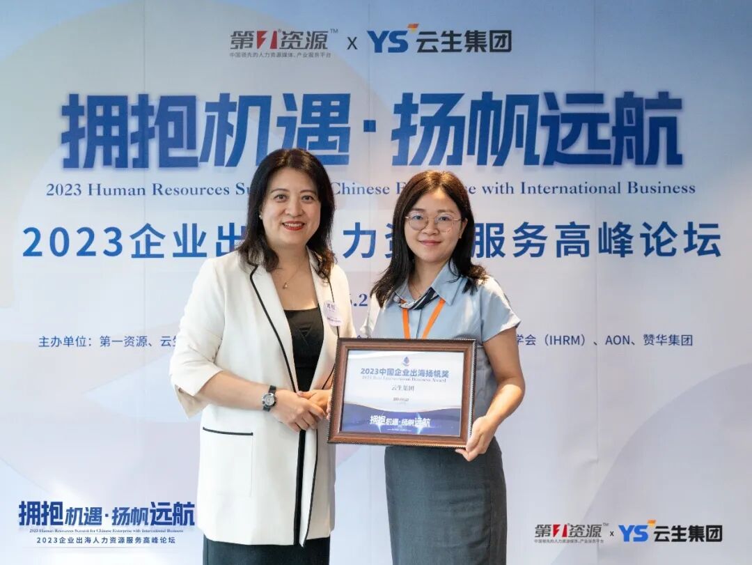 本次活动中,由第一资源组织发起的中国企业出海“扬帆奖”榜单现场发布,并举行了颁奖典礼。云生集团凭借出海易Chuhaiyi出色的产品力和服务能力获得“扬帆奖”,云生集团海外业务总监汪鸿雁代表集团领取奖牌。云生集团2015年成立于上海,是企业数字化系统解决方案提供商,坚持 “让社会更高效”的使命,视创新为源动力,在人力、科技和民生领域不断投入技术研发力量,夯实人力资源数字化能力,在数智化上探索创新。多年来,云生集团持续加强HRWORK人事通、安居乐业APP、易搭云、人社云等核心平台的技术迭代,用高效的智能化人力资源管理一站式平台帮助企业实现数字化转型,降本增效。未来,云生集团在“扬帆出海”这件事上将有长足的发展。云生集团已经在国内搭建了一张庞大的线下服务骨干网CSSN,设立了超过280家直营分子公司,服务覆盖超过660个城市;而一张庞大的全球服务骨干网GSSN也在搭建和完善中,全球重要的城市都将逐步布局云生集团的服务分支机构。云生集团助力加快构建“双循环”新发展格局,为国内经济持续发展提供重要的人力资源支撑,同时助力中国企业加强与世界经济的联系和外循环。