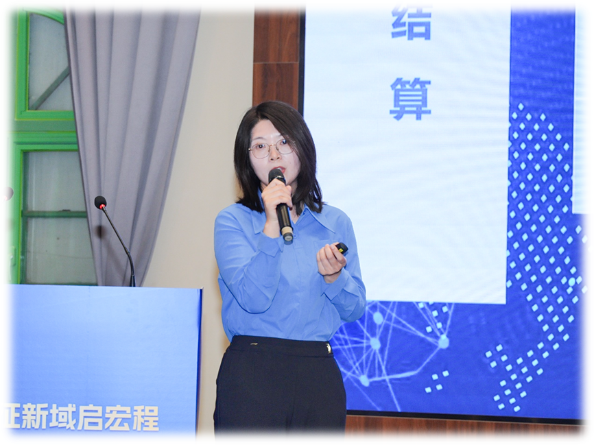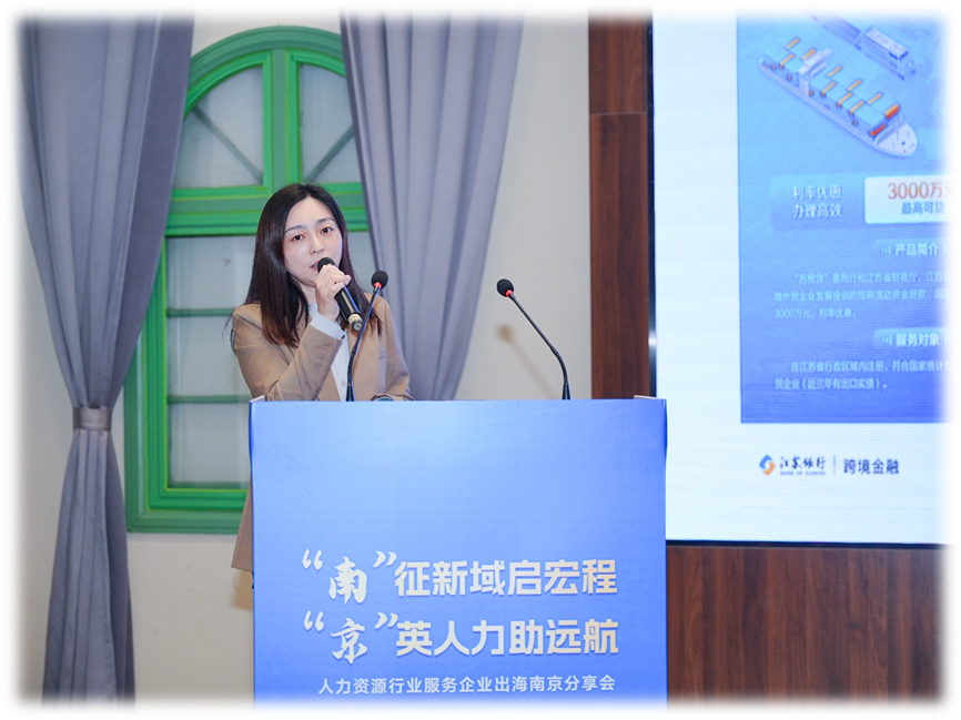 江苏银行南京分行国际业务部产品团队经理孙婷玉介绍了江苏银行“商行+投行,线上+线下,境内+境外”的本外币一体化跨境金融综合服务体系。