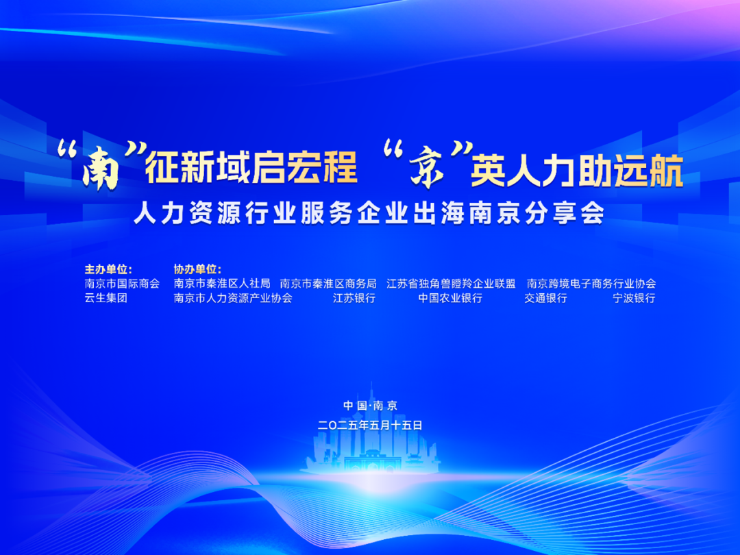 5月15日,“‘南’征新域启宏程,‘京’英人力助远航”人力资源行业服务企业出海南京分享会在南京成功举办。本次活动由南京市国际商会、云生集团主办,南京市秦淮区人社局、南京市秦淮区商务局、江苏省独角兽瞪羚企业联盟、南京跨境电子商务行业协会、南京市人力资源产业协会、交通银行、江苏银行、宁波银行和中国农业银行协办。政府、协会、企业高管、机构代表等行业精英参与活动。