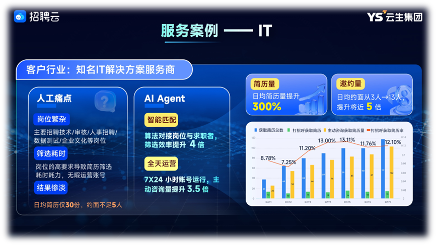 邓丽进一步介绍道:“以一家我们服务的IT企业为例,因其招聘岗位的复杂性导致HR简历筛选耗时耗力,在使用招聘云之前日均仅收到简历30份,约面不足5人。通过招聘云的AI智能匹配后,筛选效率提升了4倍,日均简历量提升了300%,日均约面从3人上升至13人,提升将近5倍。通过技术赋能与模式创新,招聘云实现了显著的降本增效成果,让企业以更低成本获得更高招聘回报。”