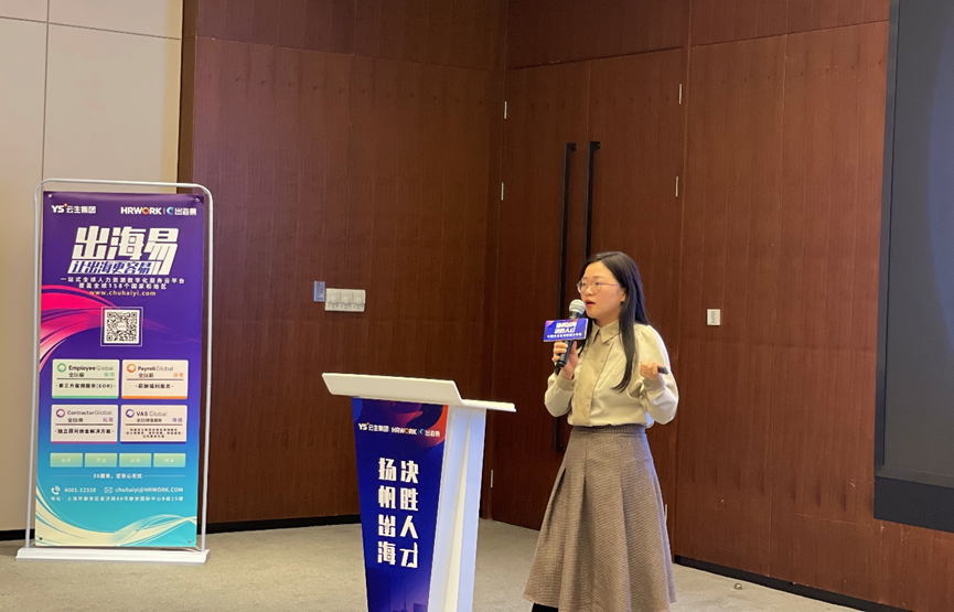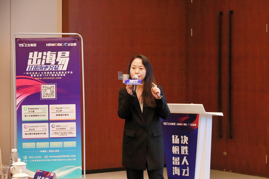 随后,云生集团海外业务总监汪鸿雁带来主题分享《海外用工常见的风险与挑战》,她指出了中国企业“走出去”海外用工的十大风险与挑战,包括劳动法律环境、解雇风险、对外投资派遣用工模式、薪酬社保个税、外籍人员准入限制、当地工会力量、文化壁垒、职场歧视、员工假期管理和职业安全与人身健康。云生集团重磅推出出海易Chuhaiyi,为中国企业出海提供安全高效的一站式全球用工数字化人力资源解决方案,以上难点痛点都能由出海易帮助解决。出海易Chuhaiyi拥有成熟的数字化能力以及覆盖全球的服务网络GSSN,基于HRWORK云平台的统一界面和本地化语言操作,可在全球158个国家和地区,为客户海外人力资源管理进行数字化高效赋能。
