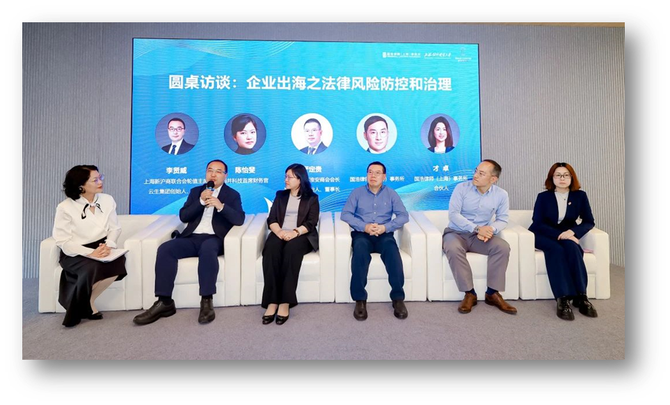 上海新沪商联合会轮值主席、云生集团创始人/CEO李贤威出席圆桌访谈环节,在国浩上海合伙人丁伟晓的主持下,李贤威与其余受邀嘉宾们共同围绕“企业出海之法律风险防控和治理”主题展开了深入的探讨,慧识云集、卓见迭出。