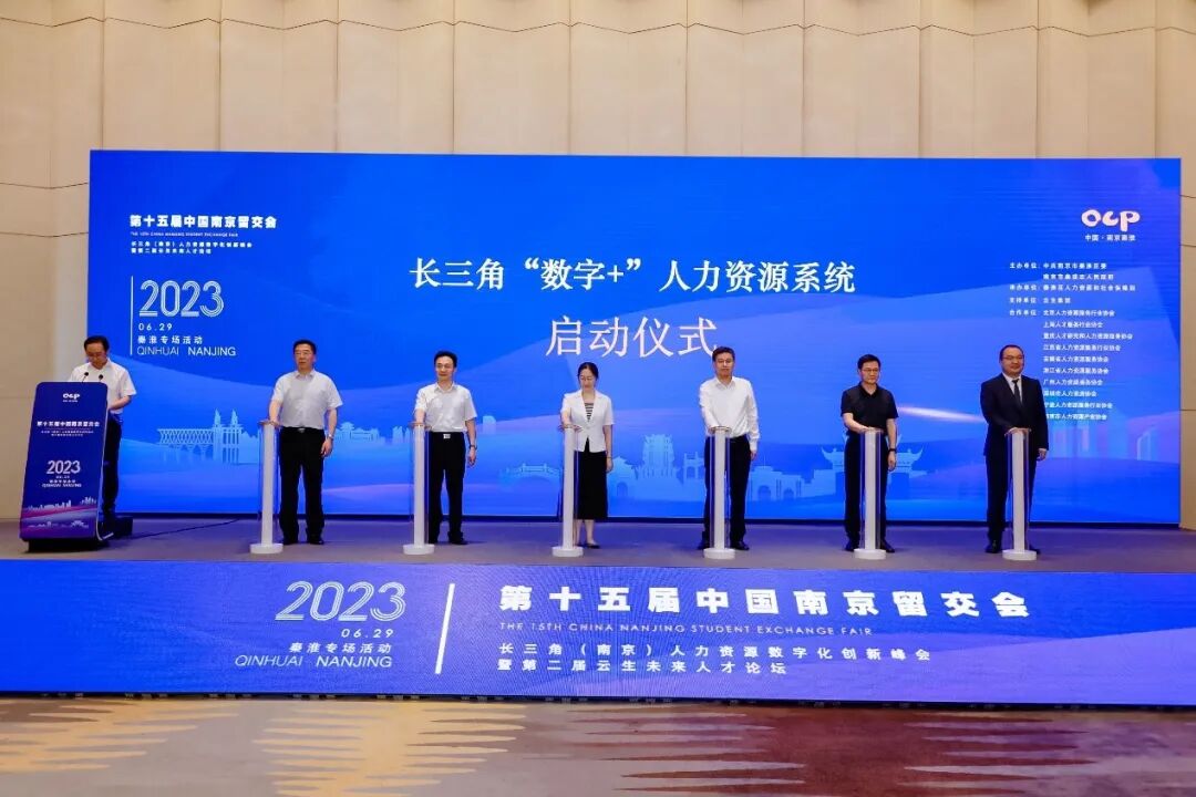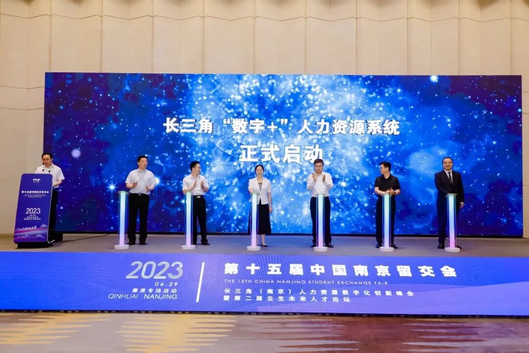 活动中举行了长三角“数字+”人力资源系统发布启动仪式,南京市人社局党组成员、市人才服务中心主任卓小琳,秦淮区委常委常务副区长董涵,区人社局党委书记黄永青,浙江省人力资源服务协会副秘书长潘卫平,南京市人力资源产业协会会长巴坤亚,云生集团创始人、CEO李贤威共同上台按下启动按钮。