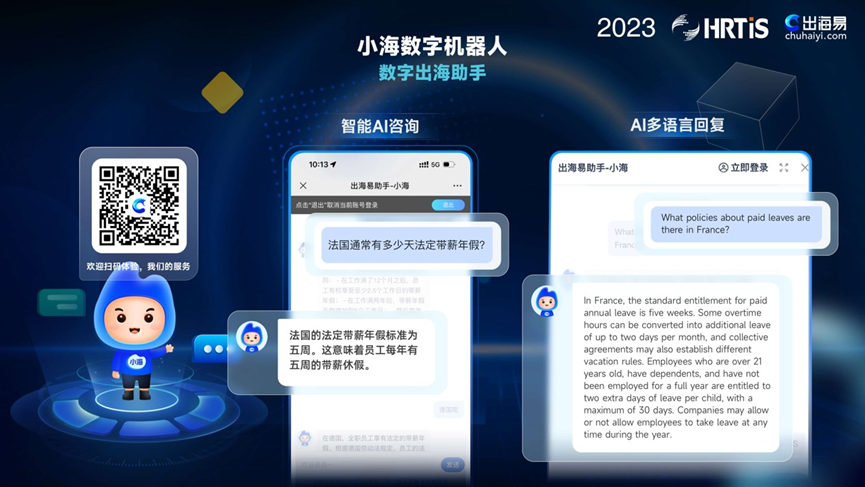 与之匹配的AI机器人“小海”,基于AI大模型技术,为用户提供智能AI咨询服务,与“小海”聊天,输入任何劳动用工问题,他都会立刻答复,例如:东南亚哪些地方税收比较低?“小海”的语言能力也很强,可以用多语言回答问题,例如:用户输入中文,他用中文回答,用户输入英文,他用英文回答。基于AI机器人,出海易chuhaiyi.com也能为用户提供出海宝典快速检索,各国用工政策查询、雇佣成本测算、全球假期查询,信息快速、准确、可靠。