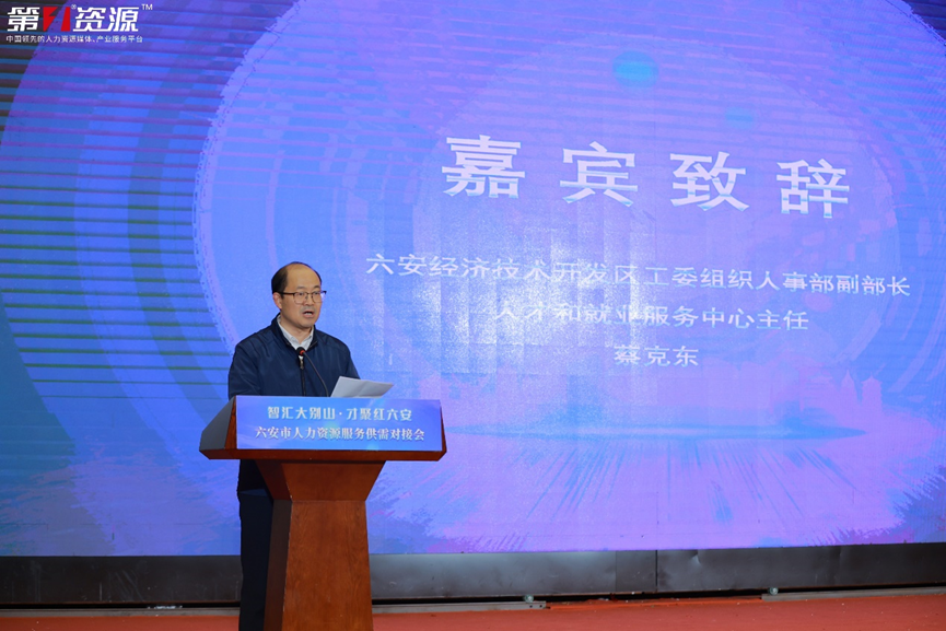 12月6日,由第一资源主办,六安市人社局和开发区人才和就业服务中心支持,六安市人力资源服务产业园(六安人才港)承办的智汇大别山·才聚红六安——六安市人力资源服务供需对接会成功举办。六安经济技术开发区工委组织人事部副部长、人才和就业服务中心主任蔡克东致开幕辞。