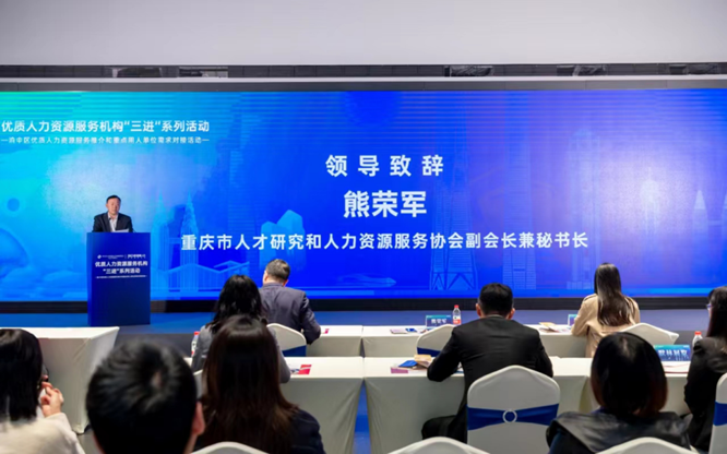 重庆市人才研究和人力资源服务协会副会长兼秘书长会长熊荣军,重庆市人渝中区就业和人才中心主任秦伦,重庆市渝中区人力资源和社会保障局谢艾伶等领导出席,重庆市人力资源机构、重点行业领域、重点产业企业相关负责人、专家学者、人力资源从业者等80余人齐聚一堂、碰撞思想,开展供需对接洽谈,探讨行业开发服务模式创新、业态升级等行业问题。