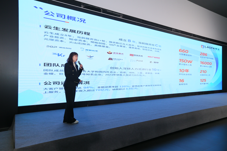 在《未来企业管理和用工合规数智化平台:LAOFA劳法》的分享中,龚霞首先介绍了云生集团一站式HR劳动关系合规运营AI创新平台“LAOFA劳法”。并表示,新时代企业人力资源管理需要数字化、合规化、高效化和便捷化。LAOFA劳法将坚持以“企业合规用工”为使命,融合互联网平台+AI大模型技术,帮助企业在用工合规上做到事前风险防范、事中危机化解、事后专家指导复盘的全生命周期风险管理。
