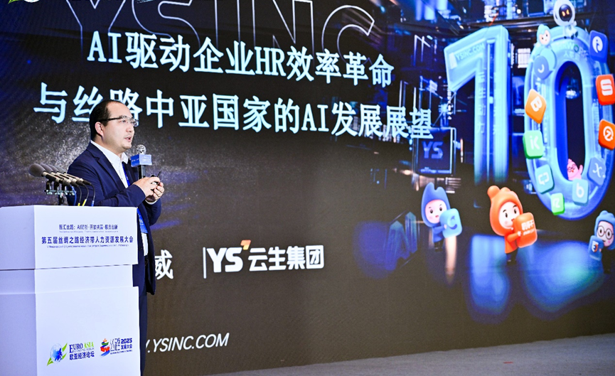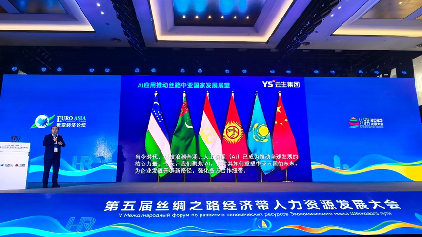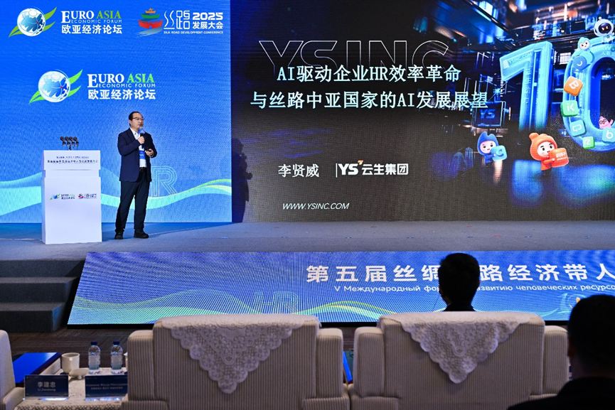 主题演讲环节,李贤威以《AI驱动企业HR效率革命,与丝路中亚国家的AI发展展望》为题展开分享,介绍了AI发展趋势、AI对人力资源管理的影响以及云生集团数智化创新成果如何赋能中资企业出海。他指出,人工智能正重塑人力资源行业生态,云生通过AI技术与人力管理深度融合,推动千行百业在人才管理、组织发展和创新能力建设方面的转型升级。