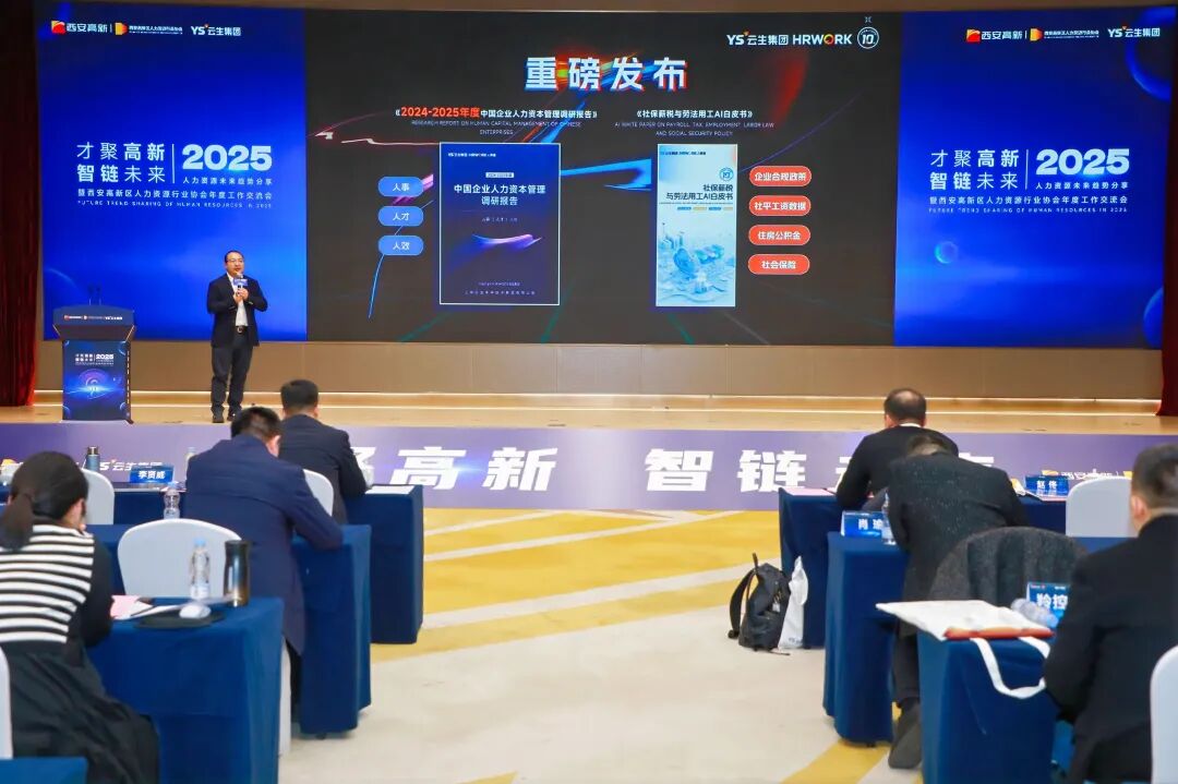 本次活动还邀请到了中国人事科学研究院企业人事管理研究室主任范巍,云生集团创始人、CEO李贤威,云生集团劳法LAOFA总经理、陕西公司总经理龚霞,围绕AI、数智化、人力合规等话题开展了主题分享,共同探讨新时代背景下AI+人力资源发展的趋势和挑战。范巍首先带来《2024-2025年企业人力资源发展态势分析与趋势展望》。范巍从2024 年企业人力资源发展态势分析、2025 年企业人力资源发展形势判断、2025 年企业人力资源发展趋势展望三个维度展开分享,介绍了《中国企业人力资源发展报告》蓝皮书。随后,李贤威带来《云生AI打造新质人力,助力企业提质增效》的主题分享,并发布了《2024-2025年度中国企业人力资本管理调研报告》、《社保薪税与劳法用工AI白皮书》和《中国企业出海服务指南(2025版)》。《调研报告》基于云生集团在人力资源服务领域的深厚积淀,结合2024年的最新调研数据和趋势,提供全新洞察视角,不仅关注人力资源管理的传统领域,如薪酬、福利、招聘和培训,也基于云生的丰富行业服务经验,提供现状解读与未来预测,深入探讨了数字化、AI大模型等前沿技术如何重塑人力资本管理的未来。《AI白皮书》则从2025年开启智能查询,云生AI引领政策检索新纪元,这是对过往连续9年发布纸质版《社保政策与用工薪酬白皮书》的一次重大升级。![]()
